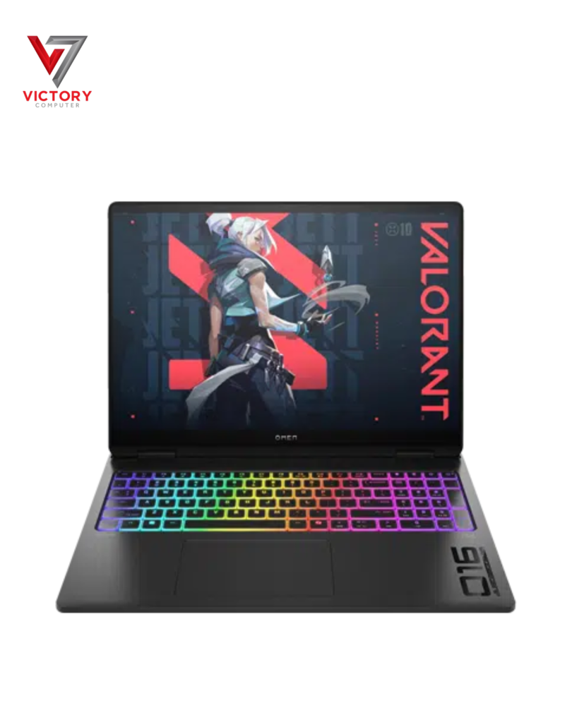 The laptop sports a robust yet sleek chassis finished in shadow black aluminum with a subtle light bar and a black chrome logo. The keyboard features per-key RGB backlighting customizable via OMEN Gaming Hub, allowing gamers to personalize their setup and enhance immersion in low-light environments.
